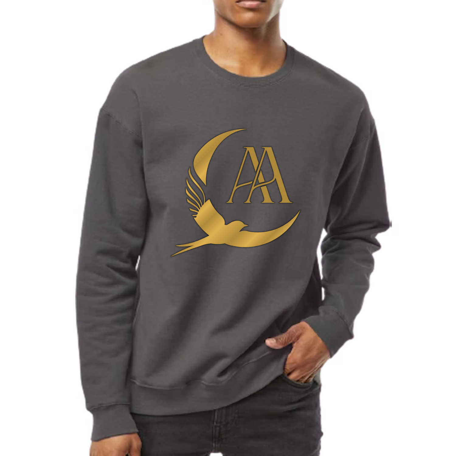 This crewneck carries the Amora Adera logo in a golden-tone print. The crescent and bird motif add distinction while the relaxed fit keeps it effortlessly wearable.
