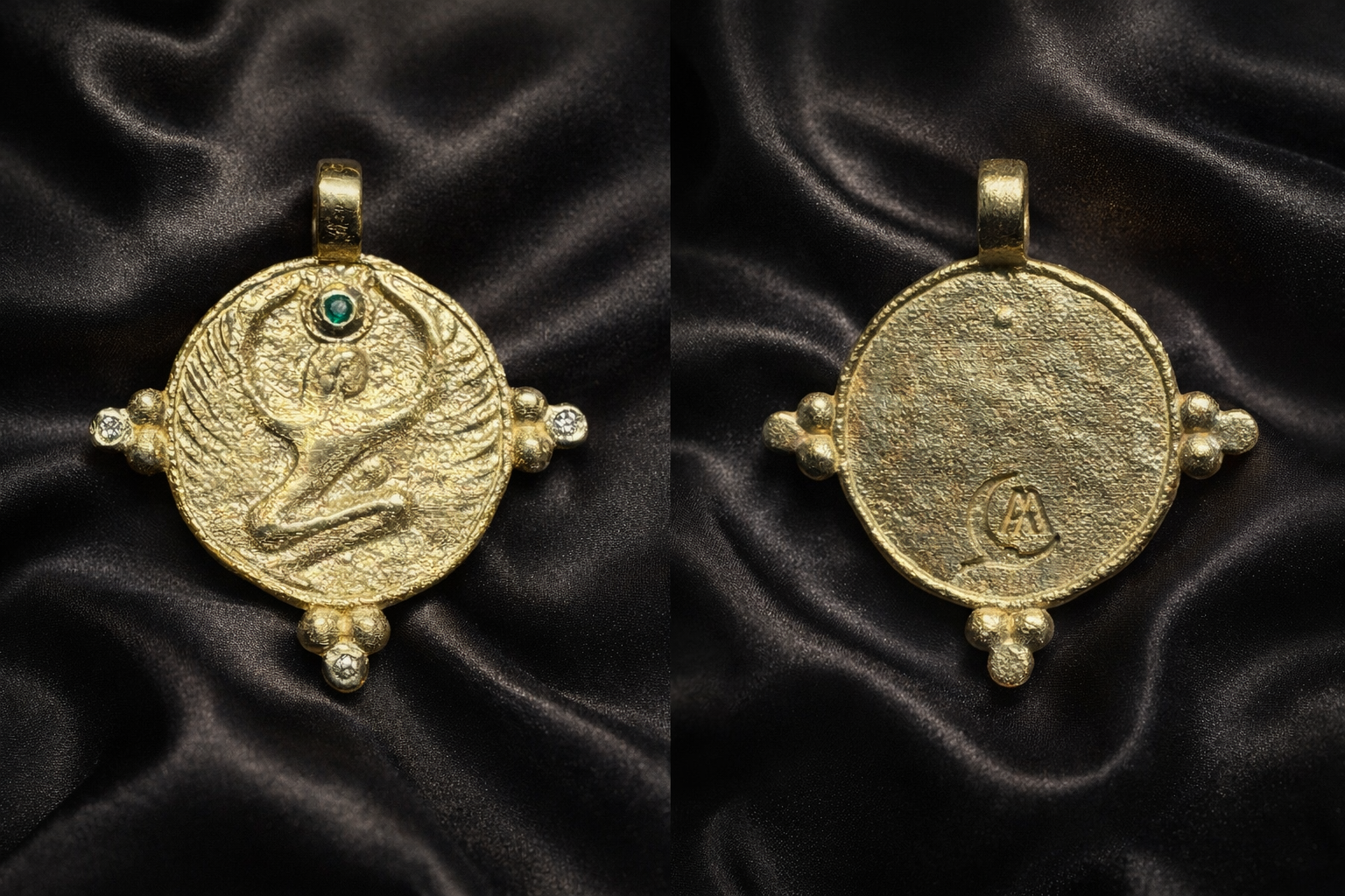 The emerald reflects the historic use of green stones in Egyptian adornment as her living heart; the triad of diamonds her eternal trinity. Her crouch is creation, her uplifted wings invocation. A modern relic for those who remember that divinity wears every face.