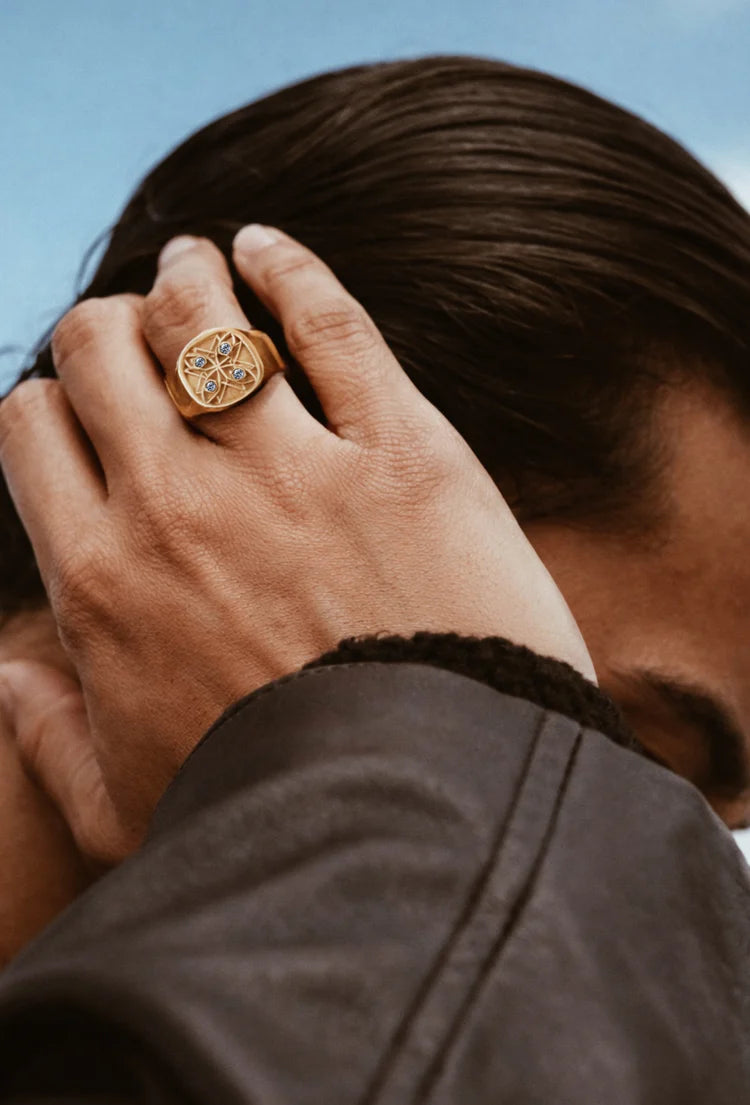 Reinterpreted in solid 18k gold, the design translates these protective forms into a modern heirloom signet.
